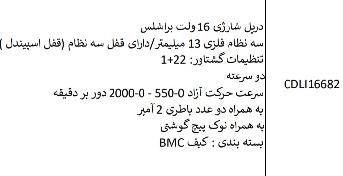 دریل شارژی ۱۶ ولت براشلس کد CDLI16682